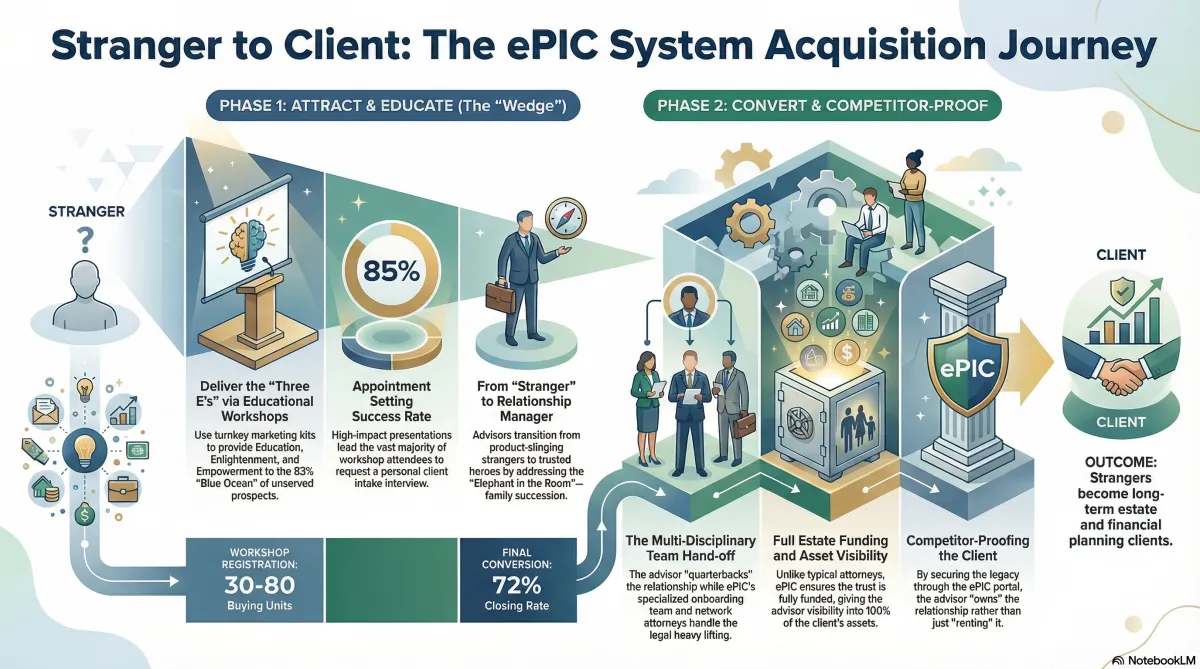 Our system offers a turnkey marketing and branding solution designed to help you win the "relationship war" through stranger marketing and educational workshops. We provide a 75-day automated email nurturing sequence, branded websites, and neuro-linguistic videos to drip on your prospects and drive them to on-demand webinars and booked meetings with you. If you choose to host live events, we charge approximately $3,500 per campaign, which includes mailers and digital marketing; PLUS, we guarantee at least 30 buying units will register for your event. We have seen an average close rate where 72% of appointments result in estate planning clients, helping you convert prospects into funded households.